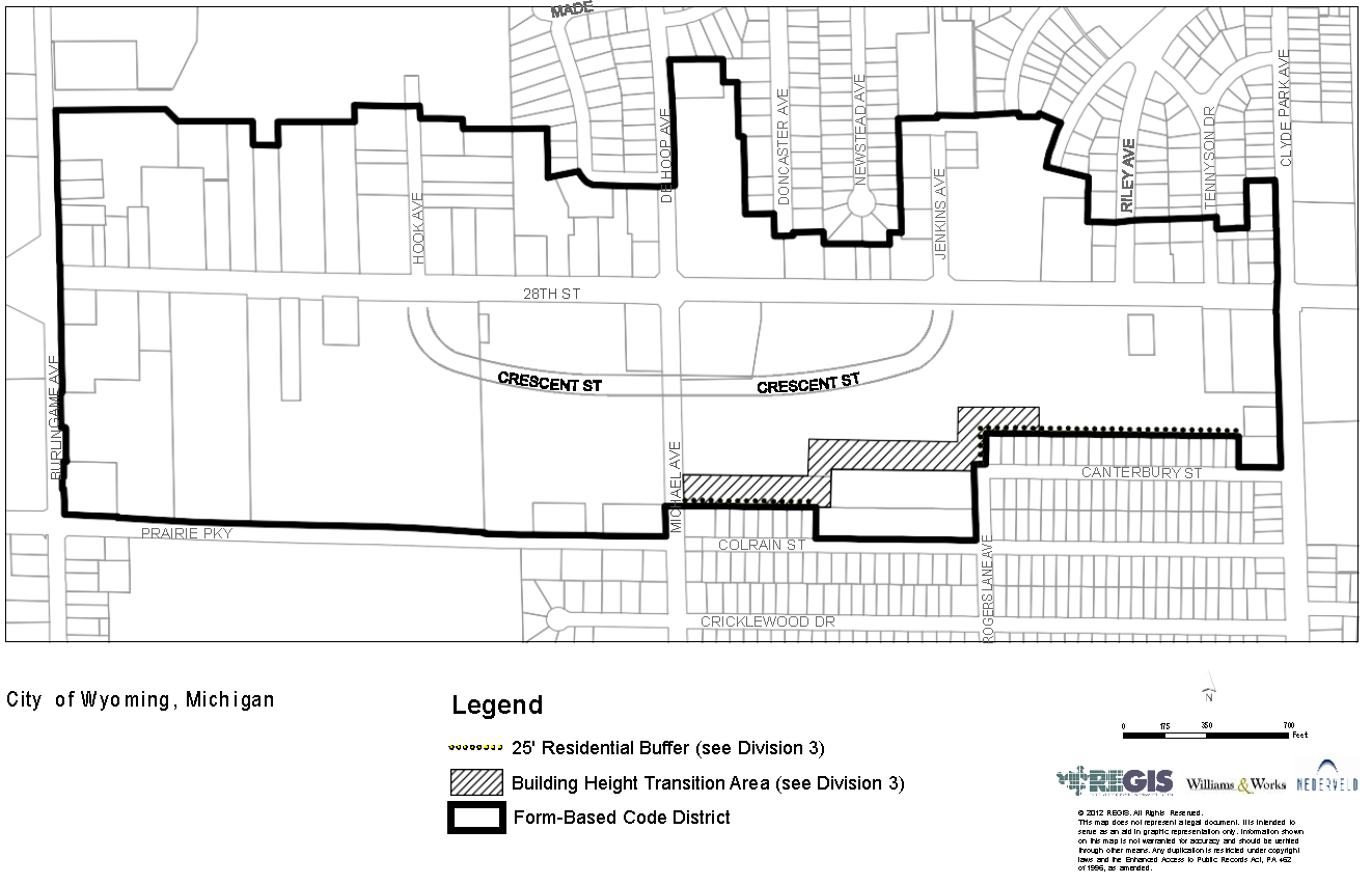 The City of Wyoming Form Based Code is intended to support redevelopment in designated Form Based Code Areas in the City of Wyoming through the establishment of building type standards, frontage type standards, and thoroughfare guidelines. The purpose of the Form Based Code is to create a compact, transit-oriented development pattern that fosters multi-modal corridors, mixed-uses, and a diversity of residential development. Designated Form Based Code Areas are depicted in the City of Wyoming Zoning Map (located in chapter 90 of the City Zoning Ordinance) and include the following: