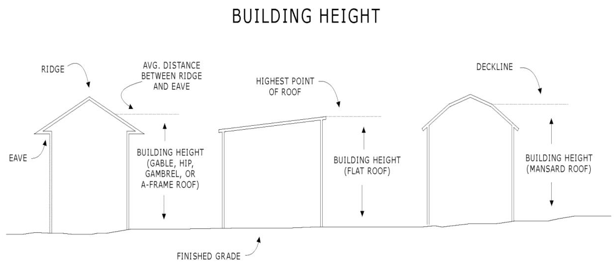 Building height: The vertical distance measured from the established grade to the highest point of the roof for flat roofs; to the deck line for mansard roofs; and to the mean height (between eaves and ridges) for gable, hip, gambrel, and A-frame roofs. Figure 90-202-2.