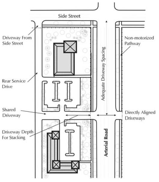 Preserve the capacity of the city's major streets by limiting and controlling the number, location and design of access points and by requiring alternate means of access through shared driveways, service drives, and access via cross streets in certain locations.