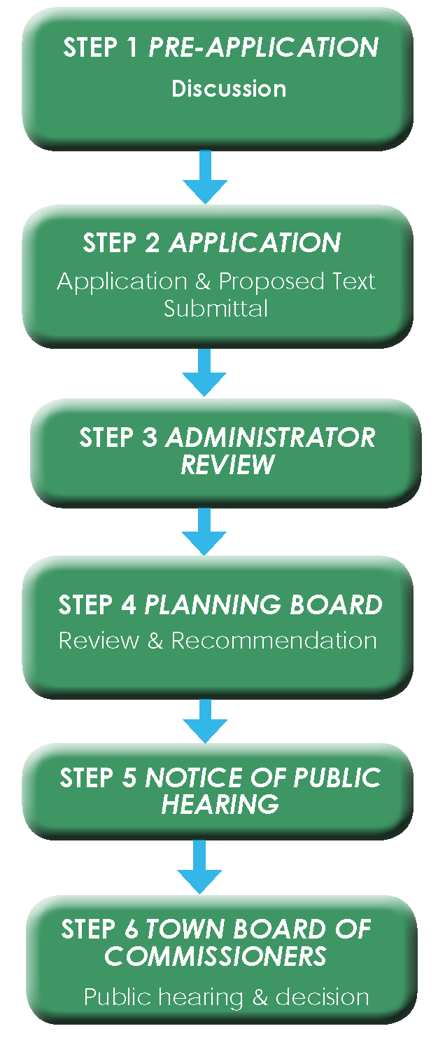 2.2.12 Text amendments. The Town Board of Commissioners may amend the text of this Development Ordinance in accordance with this section and NC GS 160D-601. The steps in the boxes below correspond with a detailed description of each step of the process on the following pages.
