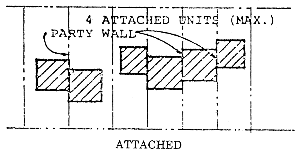 Permitted activities and building types. Planned cluster developments shall provide for individual lots which are permitted one dwelling unit in a single structure. Up to four units may be attached (party wall, see following diagram). Mobile homes are excluded from consideration as a planned cluster development except in MH district. The following diagram is illustrative of the dwelling cluster developments: