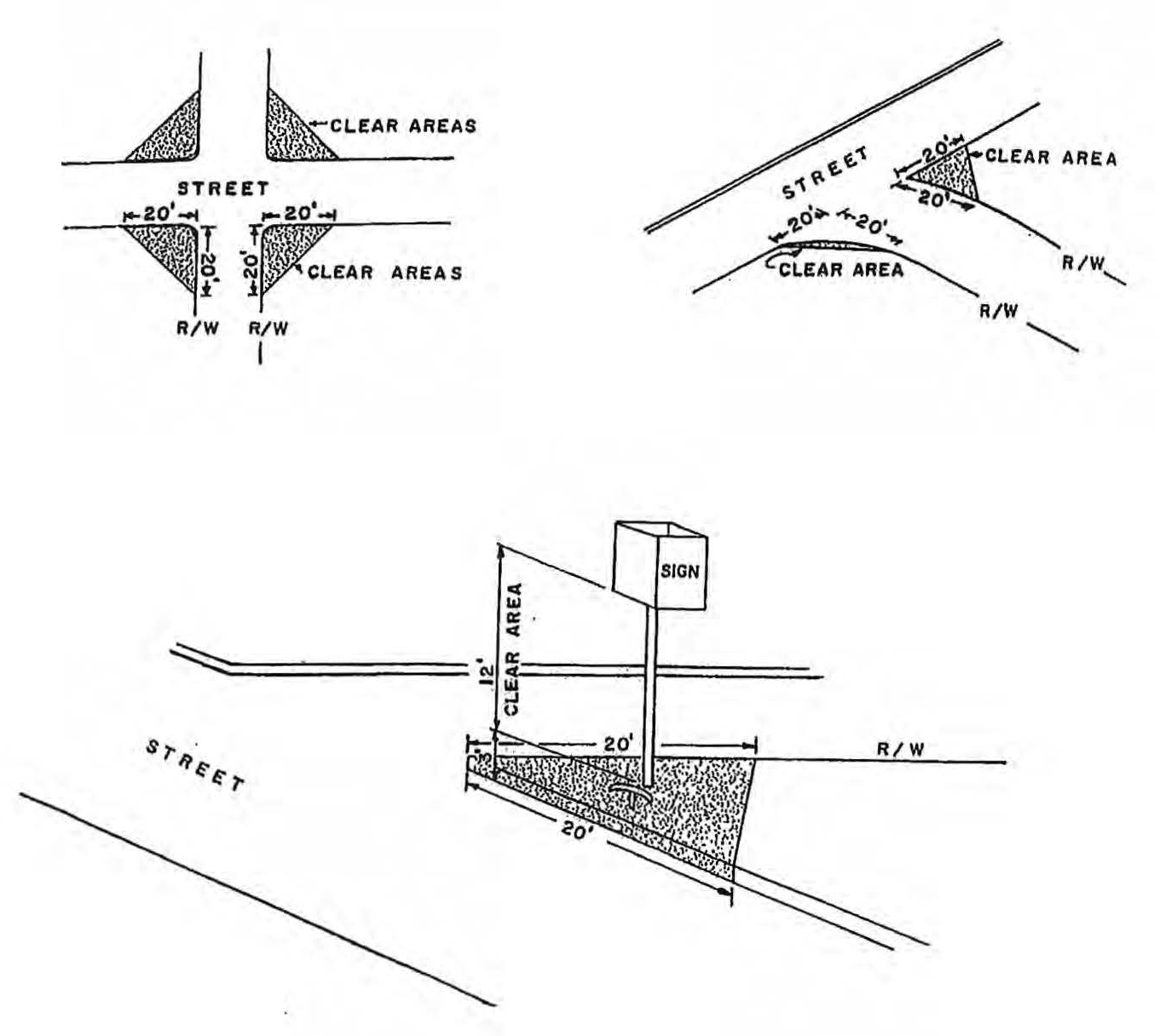 No fence, wall, sign, hedge or planting which obstructs the sight lines at elevations between three feet and 12 feet above any roadway, with the exception of utility poles, shall be placed or permitted to remain on any corner lot within a sight visibility triangle as defined by this zoning ordinance. Unless otherwise specified by the zoning administrator, the area regulated shall be within a triangular area formed by the intersection of the right-of-way lines of two streets or a street intersection with a railroad right-of-way line, and a diagonal line which intersects the right-of-way lines at two points, each 20 feet distance from the intersection of the right-of-way lines, or, in the case of a rounded corner, from the point of intersection of their tangents; provided, however, signs, lights, or similar objects which are totally located at least 12 feet above the finished grade shall be permitted. See the following illustrations.