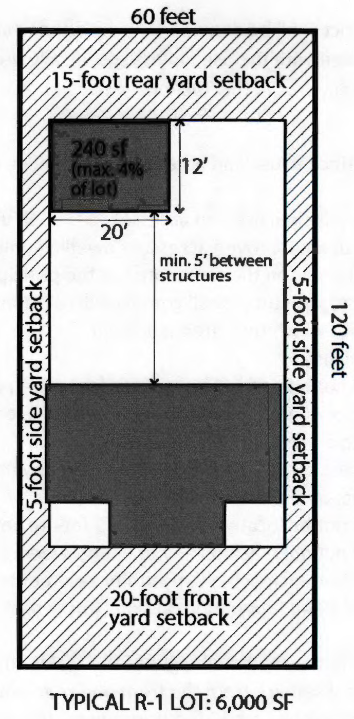 Accessory Dwelling Unit: A dwelling for one household erected as an accessory structure to a principal dwelling unit, all located on one lot. Accessory dwelling units are not allowed by right in any zoning district. They may be approved as a part of a PUD or SPUD. No more than one accessory dwelling unit is allowed per parcel.