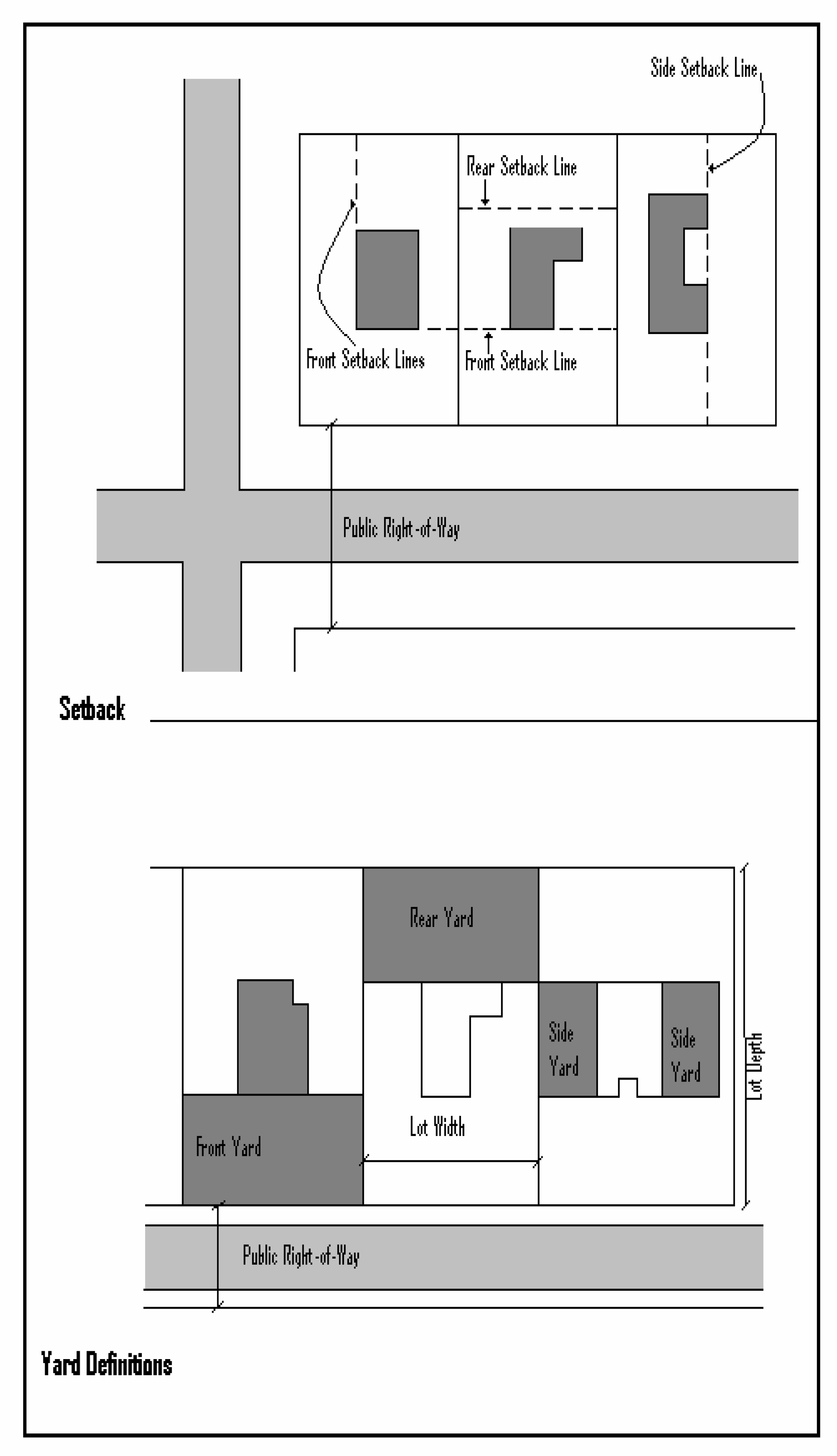 Yards means the open spaces on the same lot with a main building that are unoccupied and unobstructed from the ground upward except as otherwise provided in this ordinance, and as defined herein. Unless otherwise provided, in the case of overlapping yard requirements, the most restrictive yard requirements shall be applicable.
