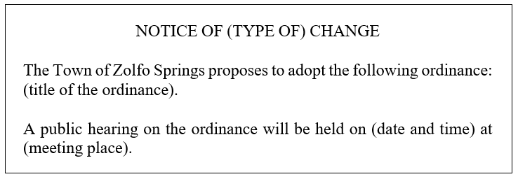 Public Notice Requirements: All procedures for advertisement of a public hearing to adopt an ordinance must be followed as adopted by the Town and set forth in Section 8.06.00 above and in keeping with Florida Statutes Chapter 166. According to State Law, the following section (A) must be adhered to: